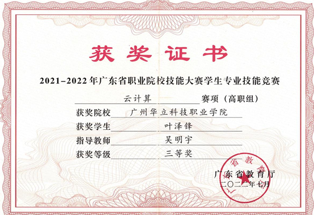(图9 省职业技能竞赛云计算赛项获奖证书)
