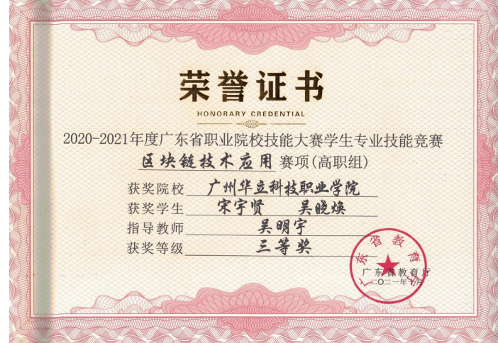 (图12 省职业技能竞赛区块链技术应用获奖证书)