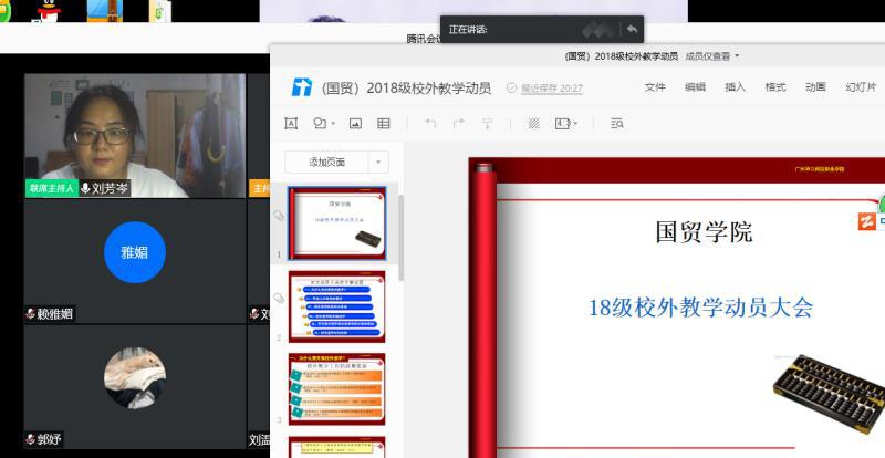 2020年4月24日9时30分,国贸学院召开2018级实习动员会及指导教师培训会。会议由隗波扬副院长主持,2018级校外指导教师参加会议。