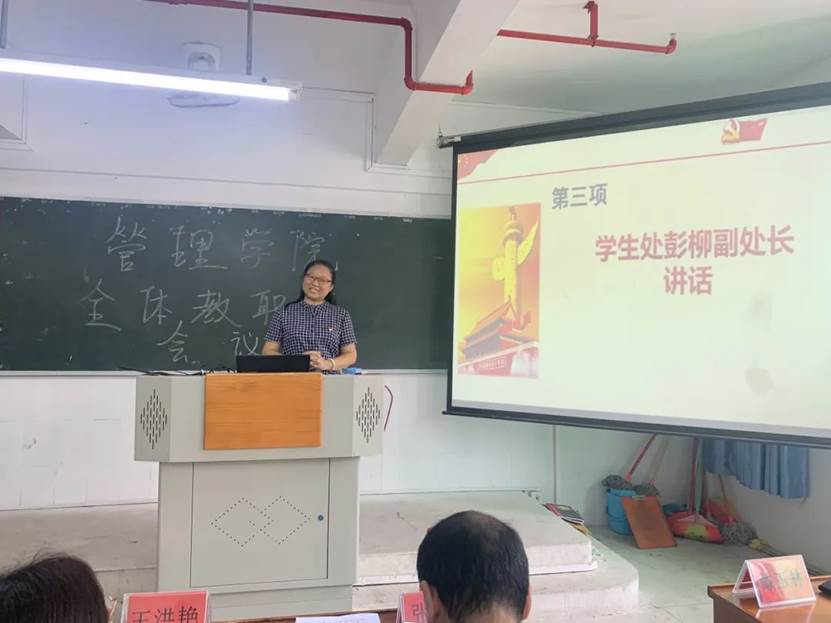 会议第三项,学生处彭柳副处长发表讲话,她先是表达了对管理学院的不舍和感恩,然后又对一起共事的管院同志们致以感谢,同时也希望管理学院在新领导的引领下更进一步,将管院党建队伍发扬光大。