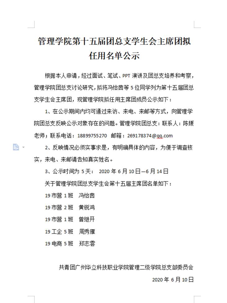 团总支学生会是学校联系学生的桥梁和纽带,是学校管理的助手和主力军,团总支学生会工作的发展是学生们共同的希望。广州华立科技职业学院管理学院团总支学生会第十五届主席团第四轮竞选于2020年6月9日晚上7点30分通过腾讯视频会议线上举行。