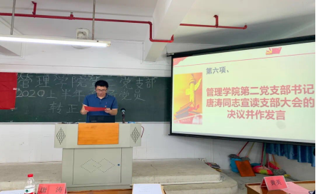 2020年6月24日中午12:00管理学院于西3#312举行管理学院第二次一人预备党员转正大会。参加本次会议的人员有:管理学院第二党支部书记唐涛同志、管理学院第二党支部组织(宣传)委员陈媛同志、学院教师党员以及学生预备党员。
