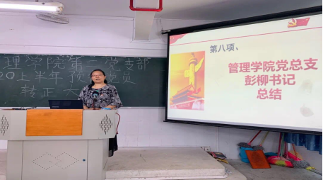 管理学院党总支书记彭柳同志总结发言,她说道:今天是18位同志的转正大会,在对大家寄予厚望的同时,也希望大家作为一名预备党员要跟入党培养人紧密联系,随时汇报,继续将理论学习与现实情况相结合,树立好党员干部的形象。最后,希望大家都要加强学习,任何时候都不能放松,牢记使命,保持党的优良作风,敢于冲锋在前,在各行各业发挥出自己的力量,时刻牢记自己的党员身份,不断前行,在自己工作岗位发光发亮。