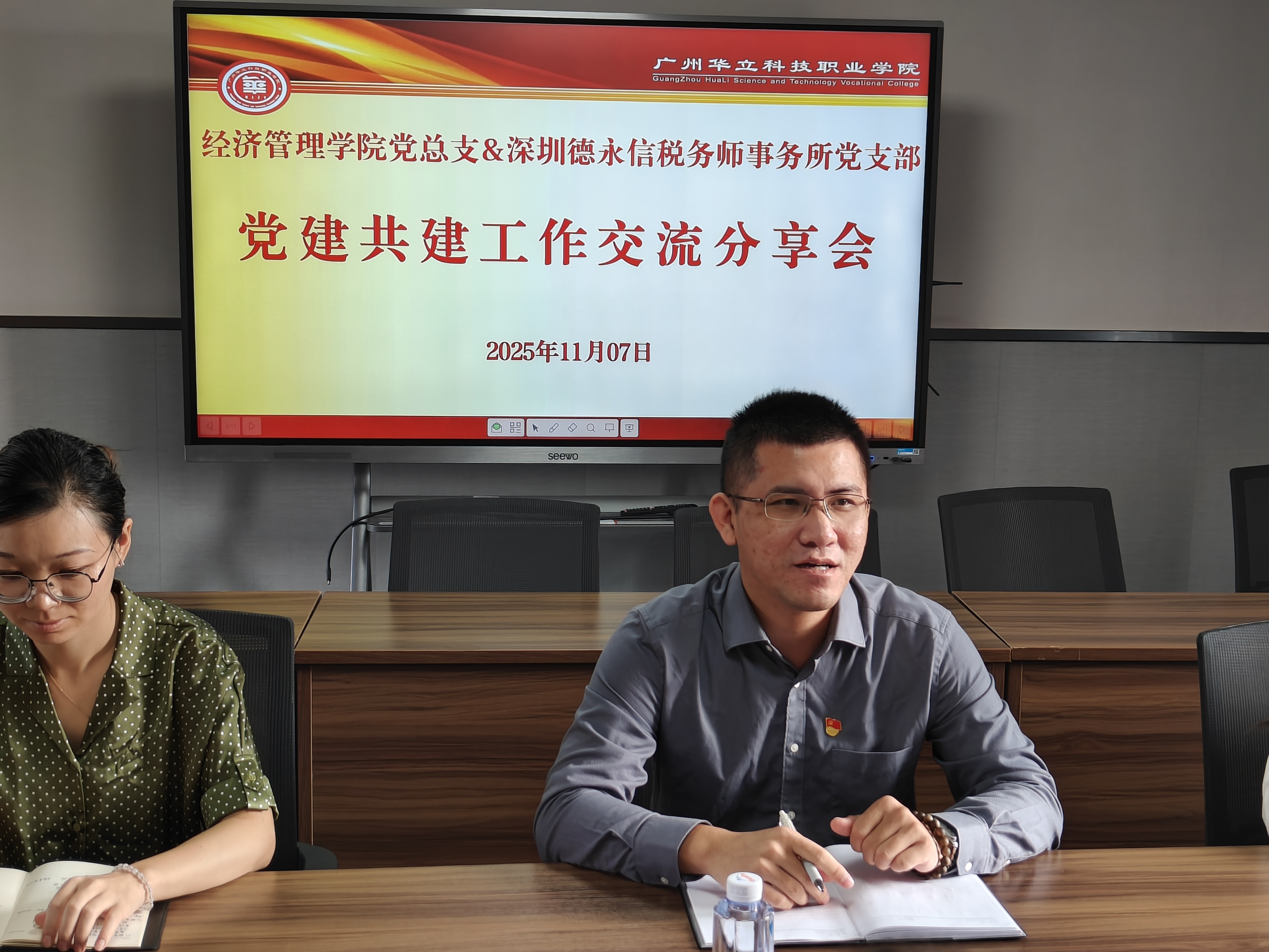 2025年11月9日上午,经济管理学院党总支与深圳德永信税务师事务所党支部在学院党员活动室联合召开党建共建研讨会。深圳德永信税务师事务所党支部书记李小龙同志,经济管理学院党总支书记、院长刘惠玲同志,党委委员、副院长朱向平同志及双方党员代表出席会议。