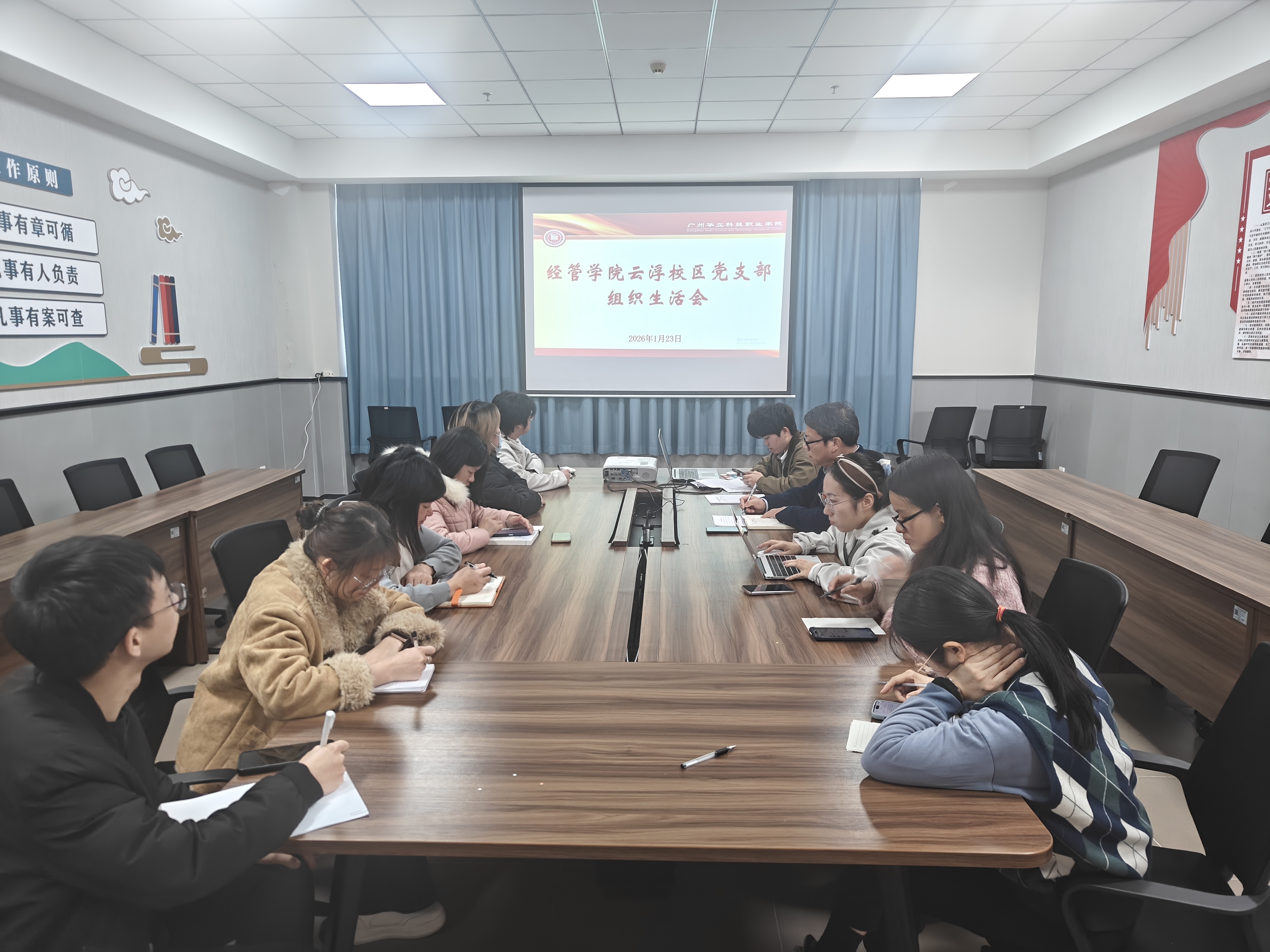 当日下午,经济管理学院教师党支部、学生党支部及云浮党支部分别召开支部组织生活会。各支部党员紧密围绕党性修养、履职担当、先锋模范作用发挥等方面开展批评与自我批评,并结合岗位实际提出改进措施。各支部会议程序规范、内容扎实,进一步强化了基层党组织的凝聚力和战斗力。