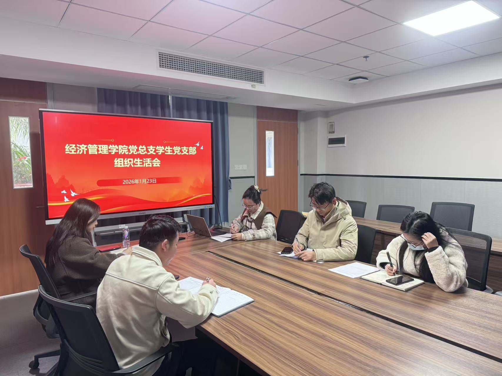 为深入学习贯彻习近平新时代中国特色社会主义思想和党的二十届四中全会精神,全面落实党中央全面从严治党部署及学校党委工作要求,切实加强党组织建设和党员干部党性锤炼,2026年1月23日,经济管理学院党总支在西一教学楼613会议室召开2025年度专题组织生活会。校党委办公室主任梁德君同志莅临指导,学院党总支委员参加会议,会议由党总支书记刘惠玲同志主持。