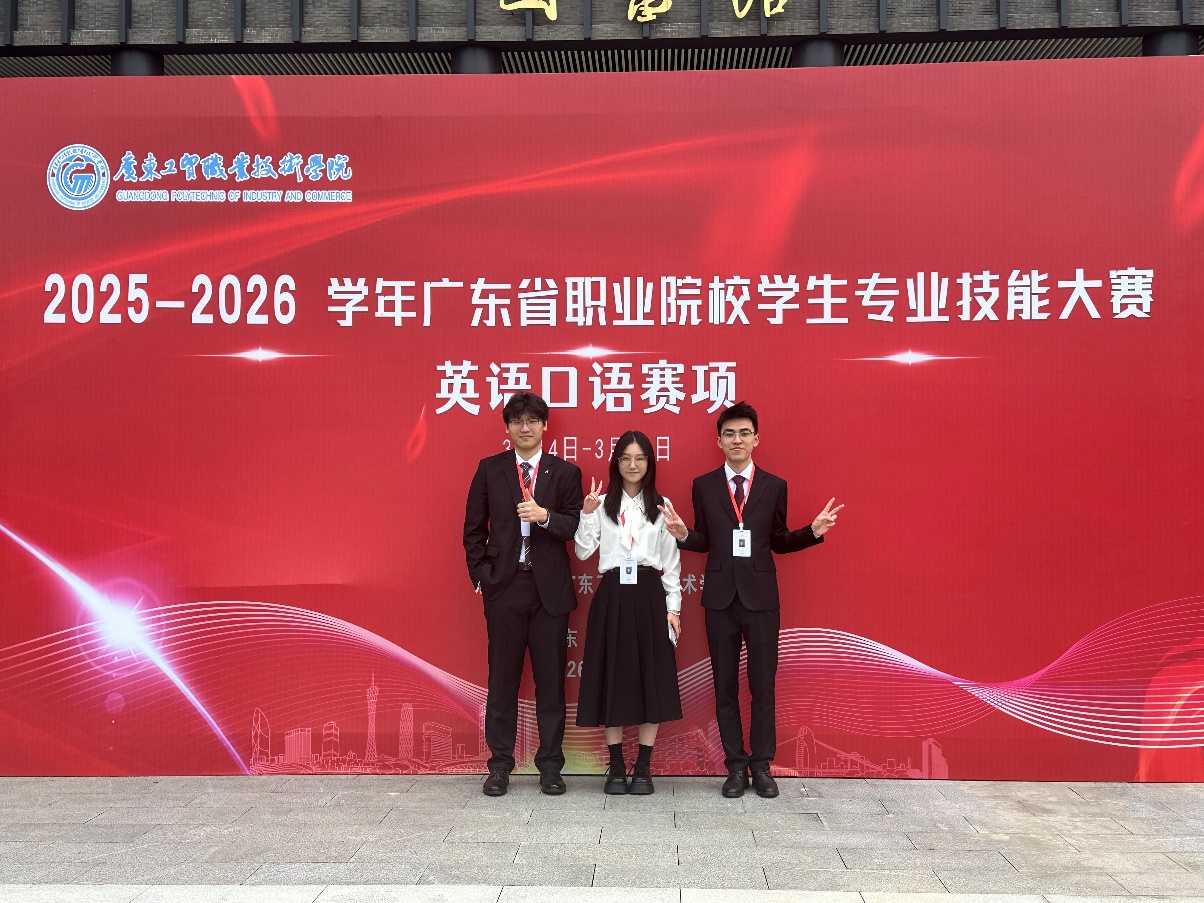3月15日至16日,由广东省教育厅主办的2025-2026年度广东省职业院校技能大赛(高职组)英语口语赛项圆满落幕。本次大赛汇聚全省87所高职院校320余名选手同台竞技,赛制设置 “职场描述”“情景交流”及“综合展示”等模块,全面考查选手英语应用能力与团队协作素养。经过两天激烈角逐,我校云浮校区经管学院刘有为、袁靖宜、吴宇峰(图1)三名同学凭借扎实的语言功底和稳定的临场发挥,荣获团体三等奖。