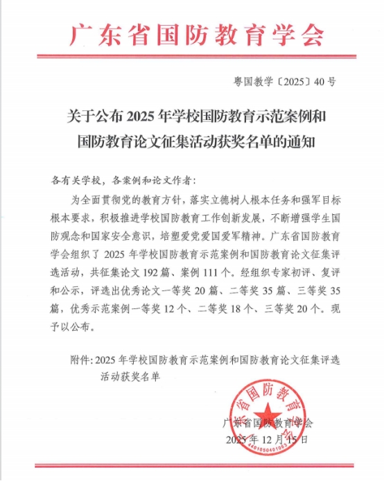 近日,我校思政课教师参加由广东省国防教育学会组织的2025年学校国防教育示范案例和国防教育论文征集评选活动并获得荣誉。其中罗冰女、陈胜军、黄冠霖等老师获示范案例一等奖,何相宁老师获优秀论文二等奖。