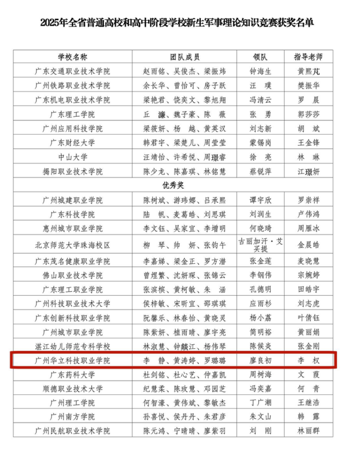 12月26日,由廖良初院长带队,李权老师担任指导老师,经济管理学院黄涛婷,罗璐璐和中医药学院李静三位同学参加“广东省普通高校2025级新生军事理论知识竞赛”圆满落幕。我校代表队在全省150所本、专科高校代表队同台竞技的激烈角逐中,凭借扎实的理论功底、默契的团队协作在众多参赛高校中脱颖而出,取得第42名的优异成绩,斩获优秀奖,充分展现了我校2025级新生良好的军事素养和精神风貌。