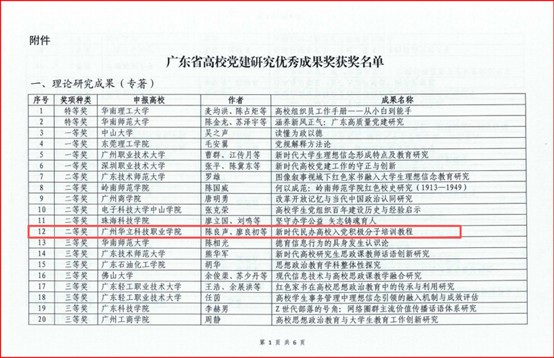 近日,广东省高等学校党的建设研究会公布了高校党建研究优秀成果奖获奖名单,全省共有103项成果获奖,其中民办高职院校只有3个项目上榜。我校党委书记陈良声、马克思主义学院院长廖良初组织思政课教师主编的《新时代民办高校入党积极分子培训教程》荣获理论研究成果(专著类)二等奖,该奖项全省共评出20项,我校是该奖项唯一获奖的高职院校。