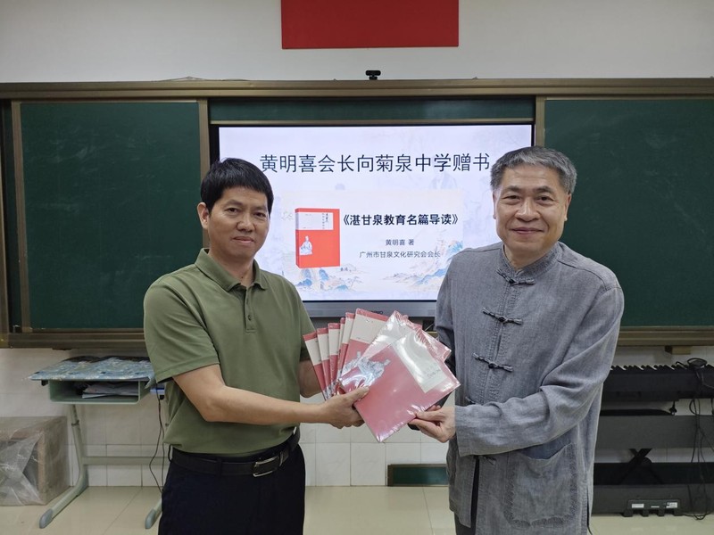 座谈会上黄明喜会长向菊泉中学赠送了他最近出版的新书《湛甘泉教育名篇导读》。