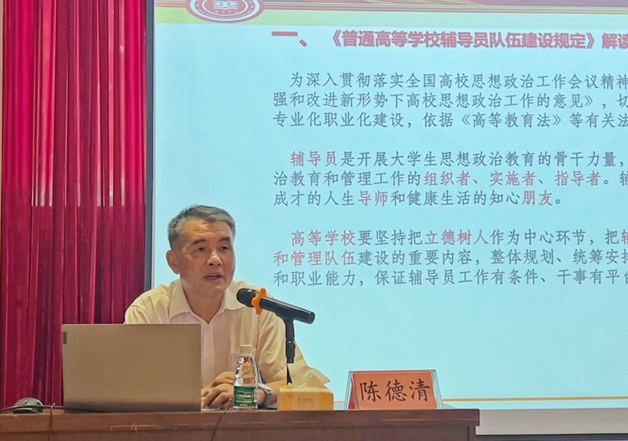 讲座中,陈德清校长首先给大家解读了《普通高等学校辅导员队伍建设规定》,明确辅导员是开展大学生思想政治教育的骨干力量,是高等学校学生日常思想政治教育和管理工作的组织者、实施者、指导者,辅导员应当努力成为学生成长成才的人生导师和健康生活的知心朋友。