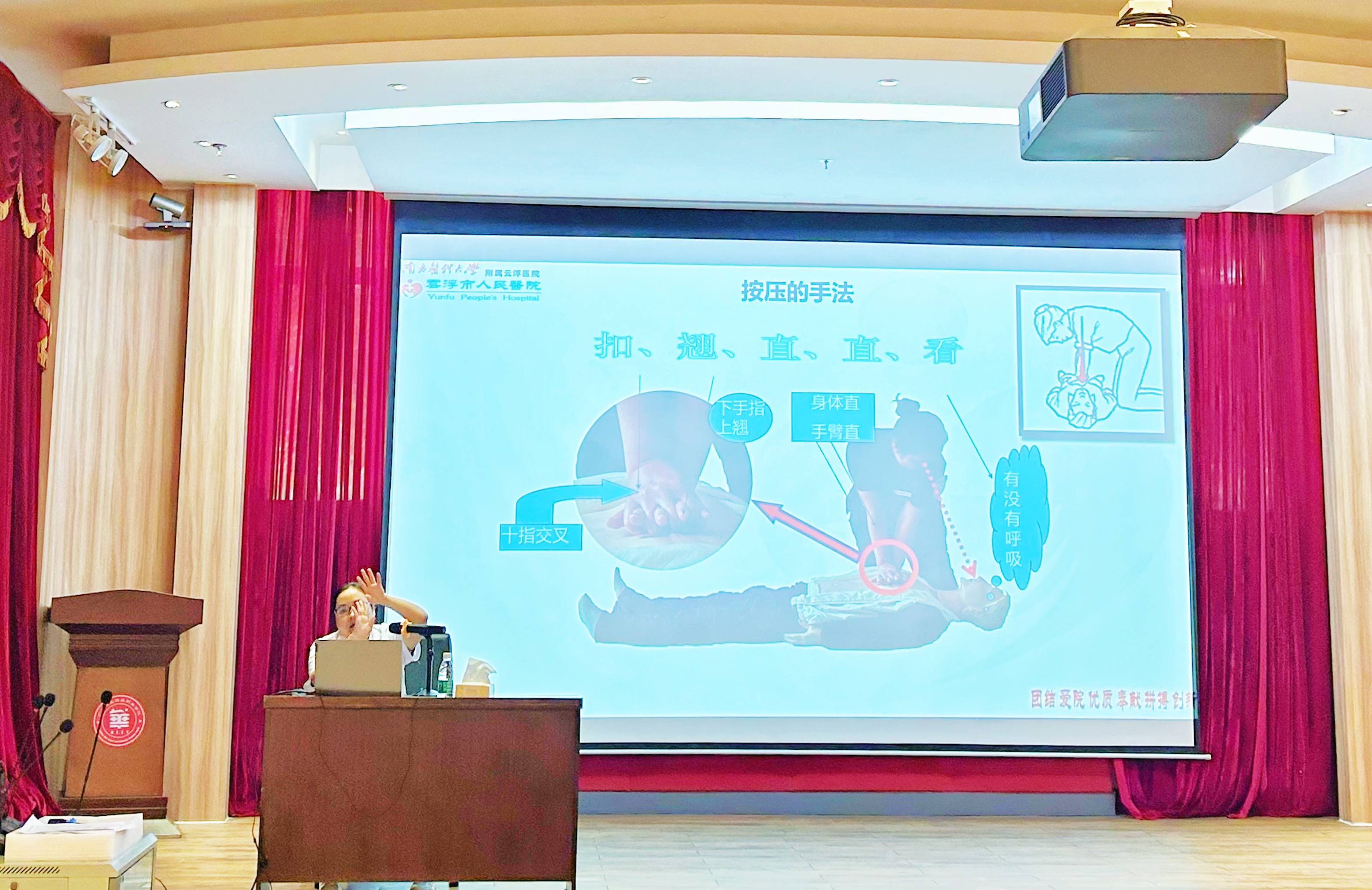 另一部分为心肺复苏(CPR)、海姆立克急救法、AED使用过程等关键技能的讲解与演示。在演练环节,医护人员结合校园内容易遇到的突发情况,重点围绕心肺复苏(CPR)等内容为辅导员展开讲解。