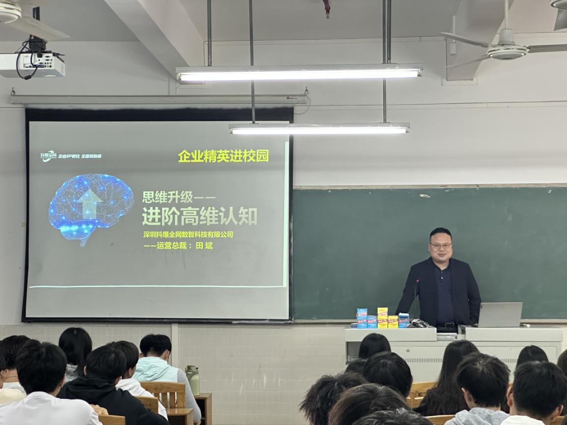 11月14日,我校云浮校区经济管理学院深邀请深圳抖爆全网数智科技有限公司运营总裁田斌来校开展题为“思维升级——进阶高维认知”的专题讲座。经管学院120余名在校生代表参加讲座。