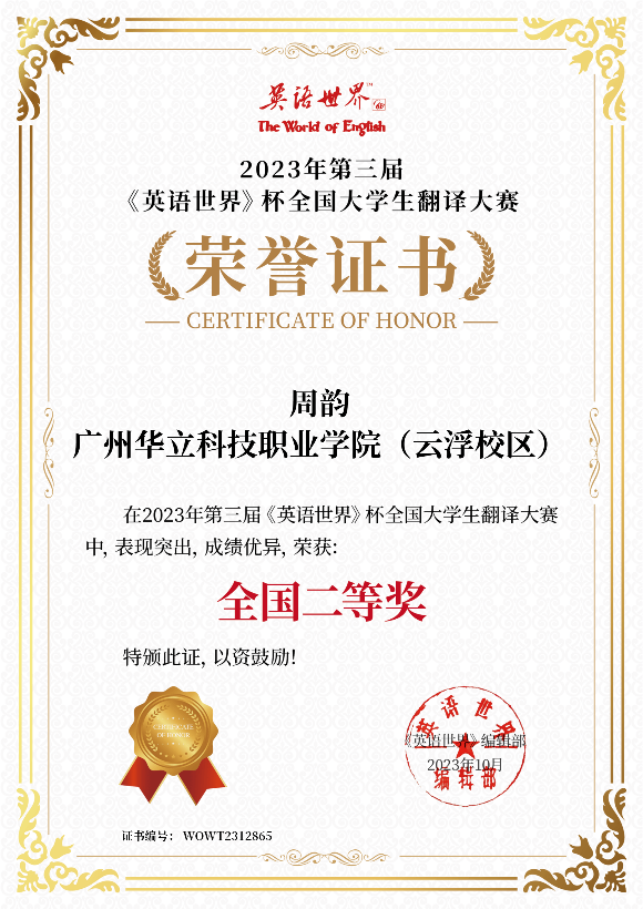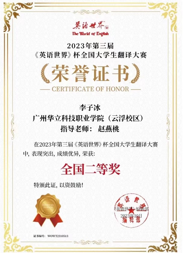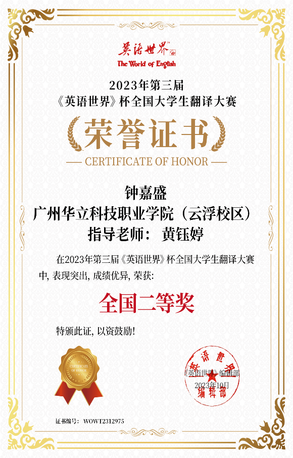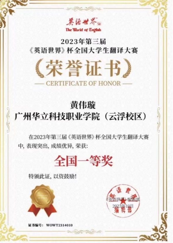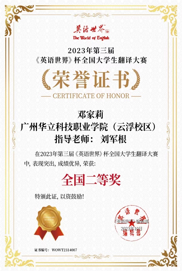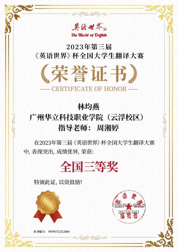 近日,由商务印书馆《英语世界》杂志社主办的2023年“第三届《英语世界》杯”全国大学生翻译大赛获奖名单出炉,我校云浮校区经管学院师生共获奖12项次,其中,黄伟璇同学获一等奖;邓家莉、钟嘉盛和周韵等同学获得二等奖;刘宇诗和林均燕等同学获得三等奖。刘军根、黄钰婷和赵燕桃等老师获得“优秀指导老师”称号。