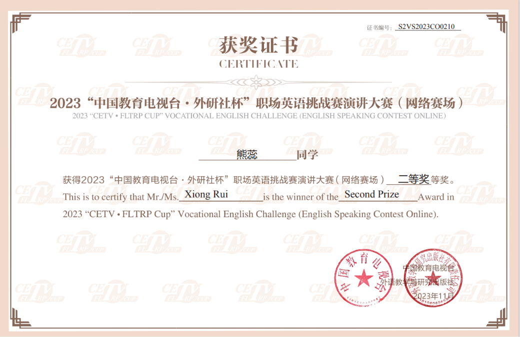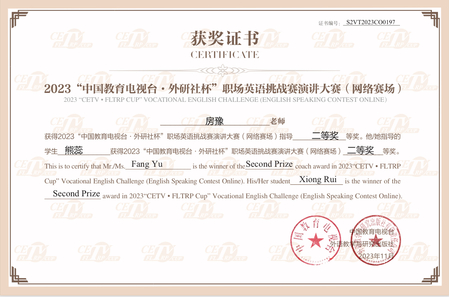 近日,2023“中国教育电视台·外研社杯”职场英语挑战赛演讲大赛网络赛圆满落幕。我校经管学院2022级商英1班熊蕊同学荣得二等奖,房豫老师获得指导二等奖。