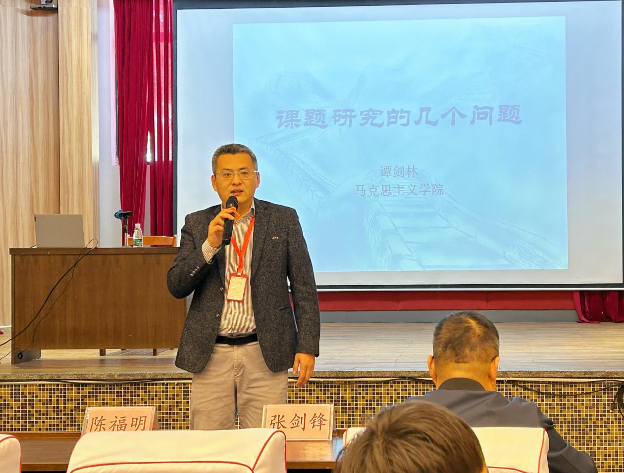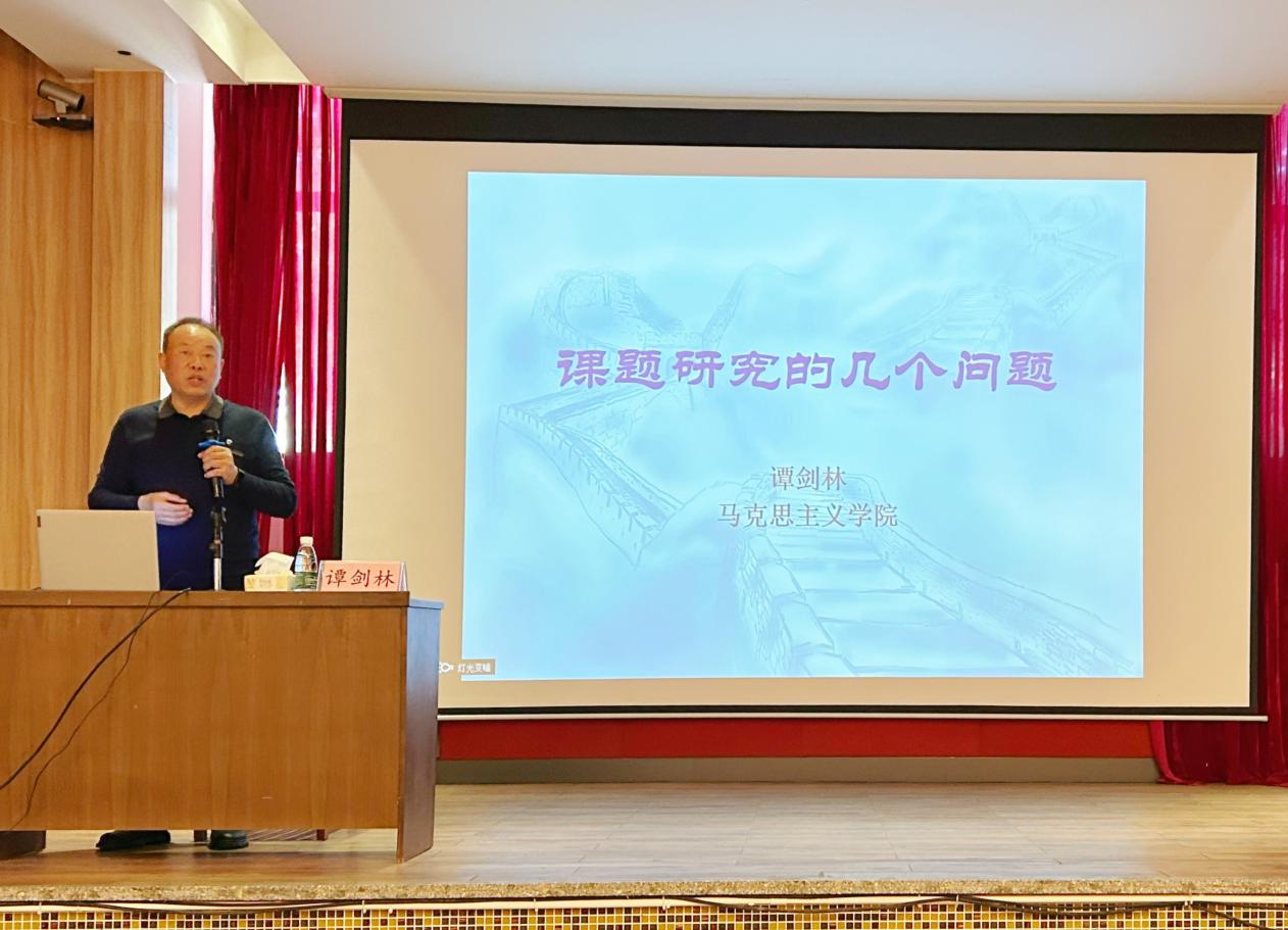 马克思主义学院副院长谭剑林教授以《课题研究的几个问题》为题,结合自己主持国家教育科学规划课题的经历和心得,从研究选题论证、材料撰写、申报立项、组织实施研究、成果与结题等方面出发,深入浅出的讲解了开展哲学社会科学课题研究的环节、步骤和方法等内容。城建学院王唤良教授以《科研伴随人生》为题,围绕自然科学课题的级别与种类、论文期刊的种类与层次、论文影响因子的计算与分区、高职院校开展科研工作存在的问题及对策等内容,详细阐述了高职院校教师应如何培养科研意识、如何开展科研工作、如何撰写论文等。