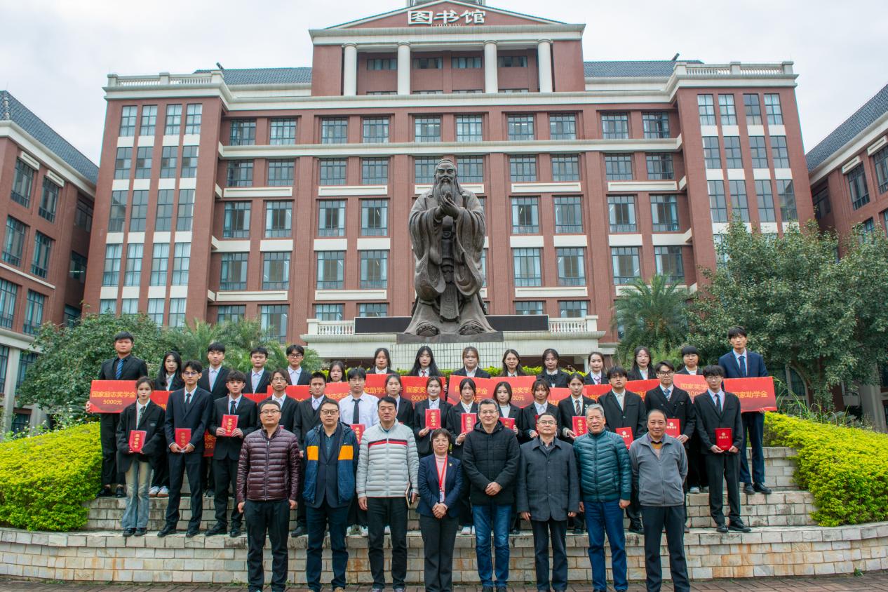 校领导和各院系领导为受到表彰的获奖代表颁发荣誉证书及奖牌;国家助学金获得者教育学院 22学前4班周依炜同学、国家奖学金获得者城建学院 22地矿1班张语嫣同学分别代表发言。