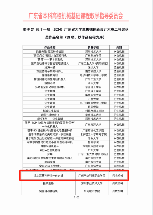 我校参赛团队在指导老师的精心指导下,赛前认真准备,优化设计,模拟改进,积极备战;赛中沉着自信,不畏强手,展现出扎实的专业知识和技能水平,深受评审专家一致好评。最终,凭借出色参赛表现,团队作品《深水莲藕种养收一体农机》荣获省赛二等奖!