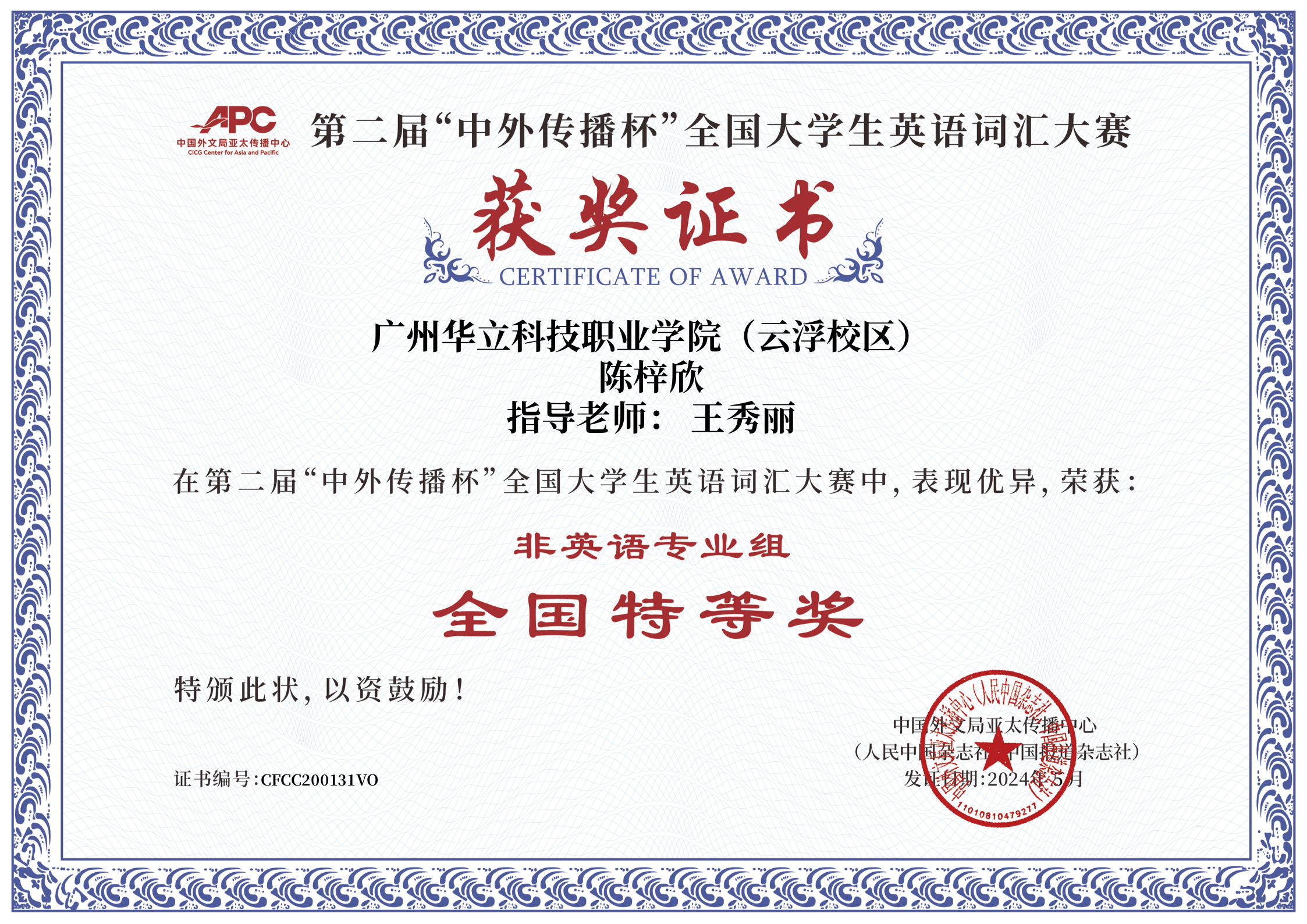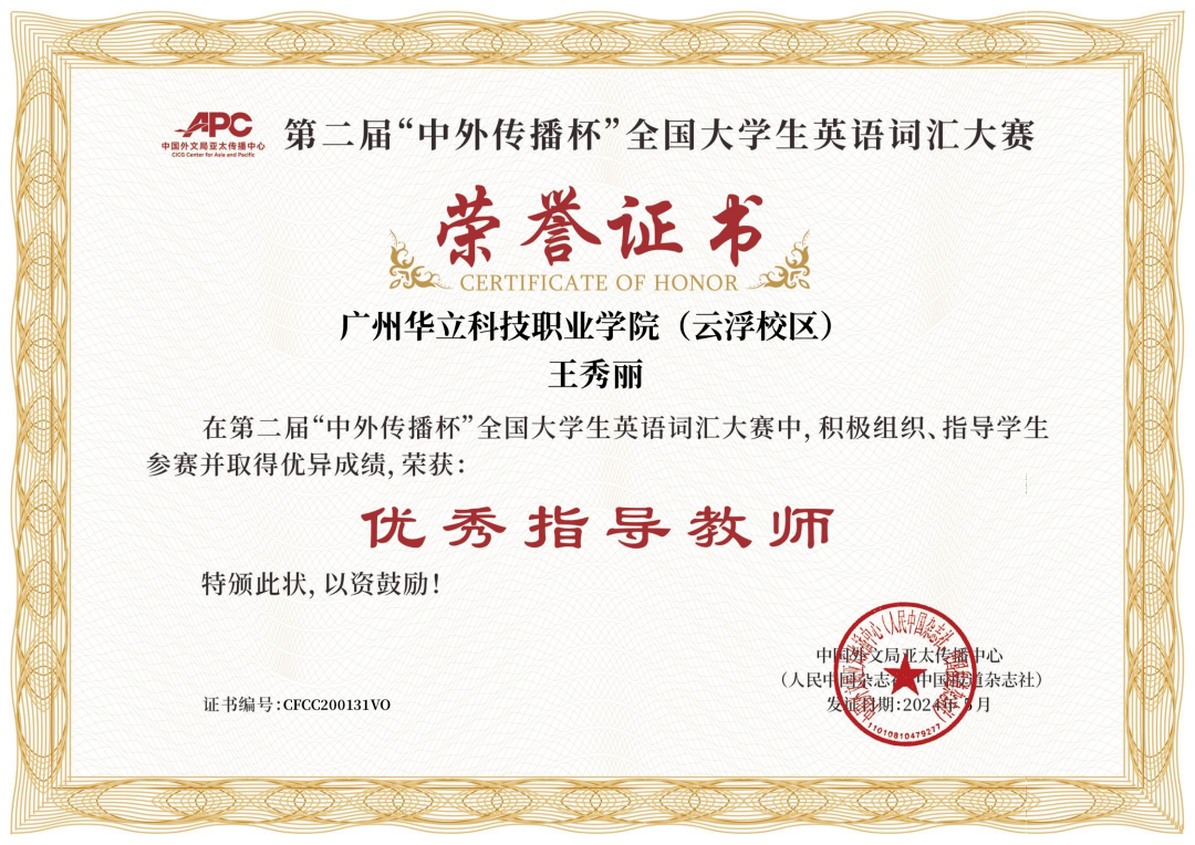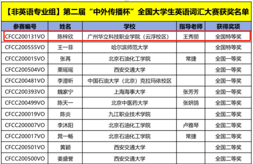 近日,第二届“中外传播杯”全国大学生英语词汇大赛传来捷报,广州华立科技职业学院云浮校区经管学院2022级陈梓欣同学获得大赛非英语专业组全国特等奖,王秀丽老师获“优秀指导老师”称号,创造了我校在该项赛事上的最好成绩!