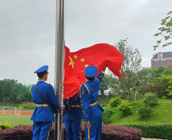 伴随着激昂的《义勇军进行曲》中,鲜艳的五星红旗在激昂的国歌声中缓缓升起,全体师生面向国旗行注目礼,心中充满对祖国的敬意和热爱。五星红旗迎着初升的朝阳冉冉升起。