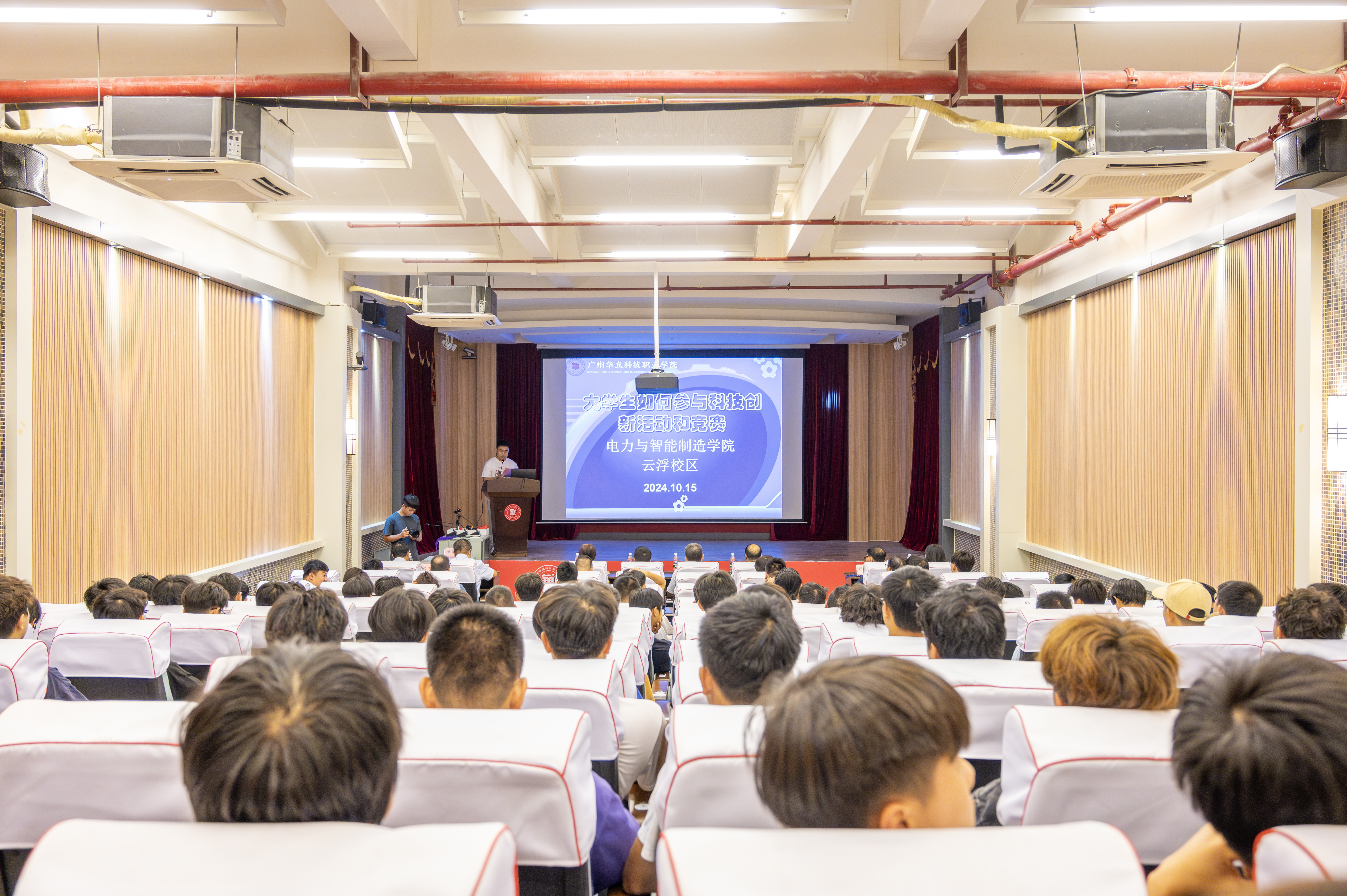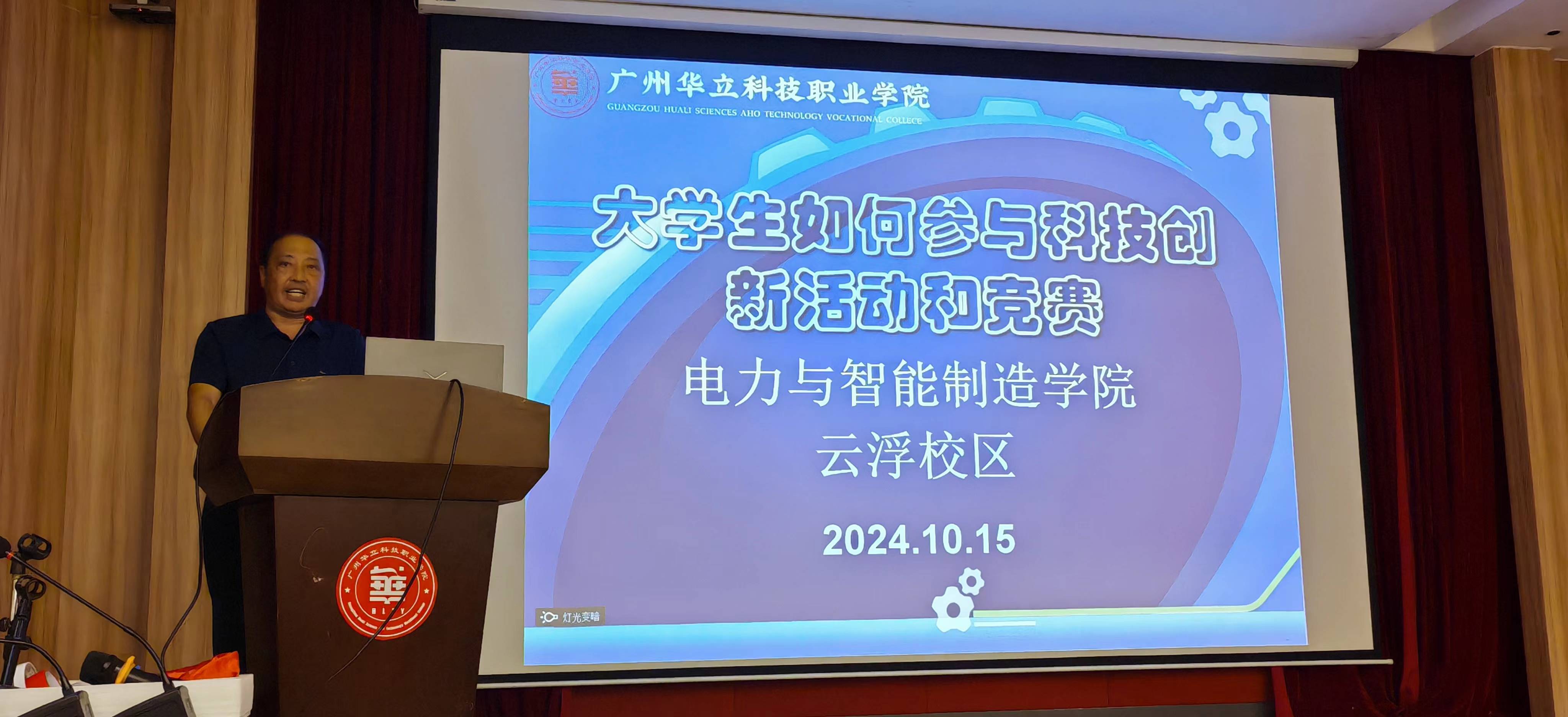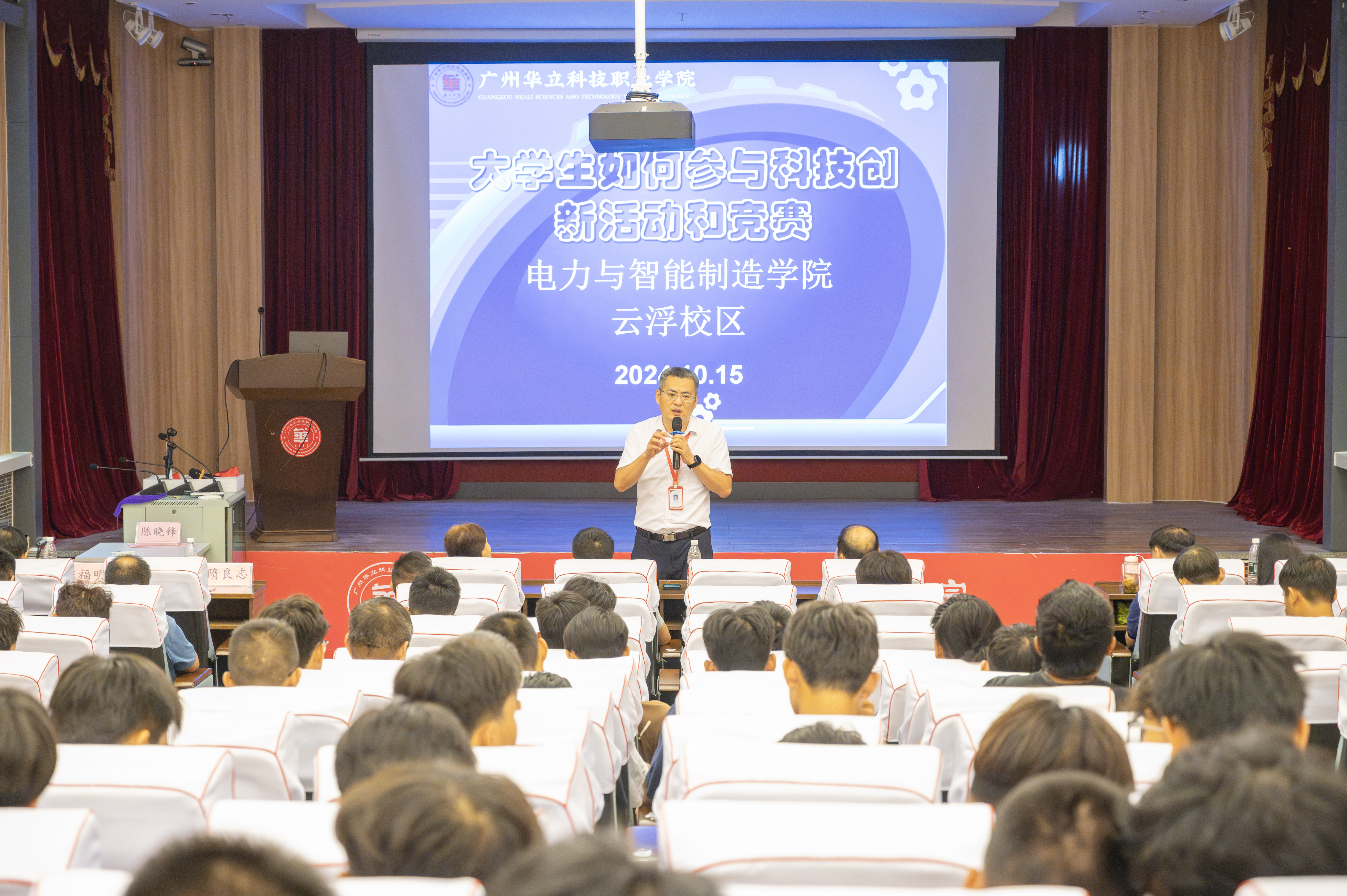 为了营造“技高行天下,能强走世界”的职业技能竞赛氛围,10月15日,我校云浮校区电力与智能制造学院在图书馆礼堂举办“大学生参与科研和竞赛专题讲座·暨24级培训班开班典礼”活动。校长助理张剑锋,教务处副处长伍思立,科研处科长王秀丽,督导隋良志、陈福明,电力学院副院长马洪德和骨干教师、2024级学生参加了会议。会上电力学院孙学雁教授作专题报告。