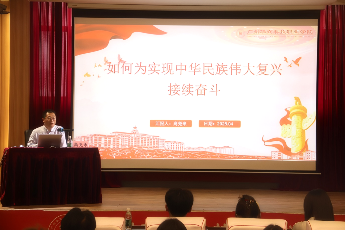 2025年4月10日,广州华立科技职业学院“青马工程”培训班第八讲在云浮校区小礼堂开讲。学校党委副书记、副校长高尧来以“如何为实现中华民族伟大复兴接续奋斗” 为主题切入,与全体青马学员共话使命担当,为青年学子点亮理想明灯。培训讲座由校团委办公室雷洋主持,云浮校区青马班全体学员参加。