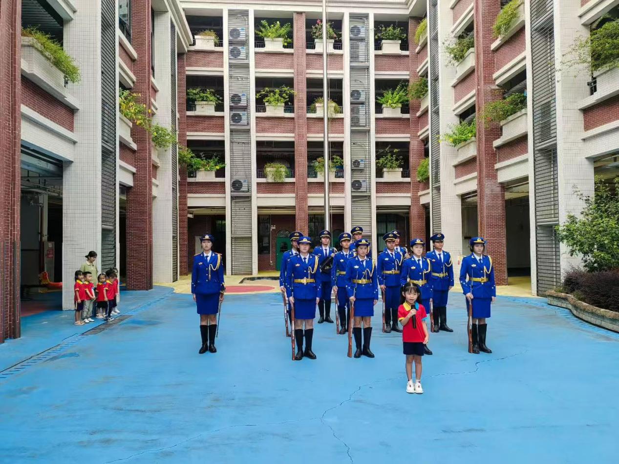 升旗仪式上,仪仗队成员身着统一礼服,迈着整齐的步伐走向升旗台。随着《义勇军进行曲》奏响,全体师生与仪仗队员肃立致敬。孩子们挺直身躯,目光坚定地注视国旗,用稚嫩而响亮的童声齐唱国歌,共同见证这一庄严时刻。国旗在晨光中徐徐升起,园长在国旗下讲话中表示:“每一次升旗都是一次心灵的洗礼,今天的仪式尤其令人难忘。仪仗队员们用青春守护的国旗,因孩子们的注视而更加熠熠生辉。”通过活动参与,孩子们对“国旗红”与“国防绿”背后的责任有了初步理解。