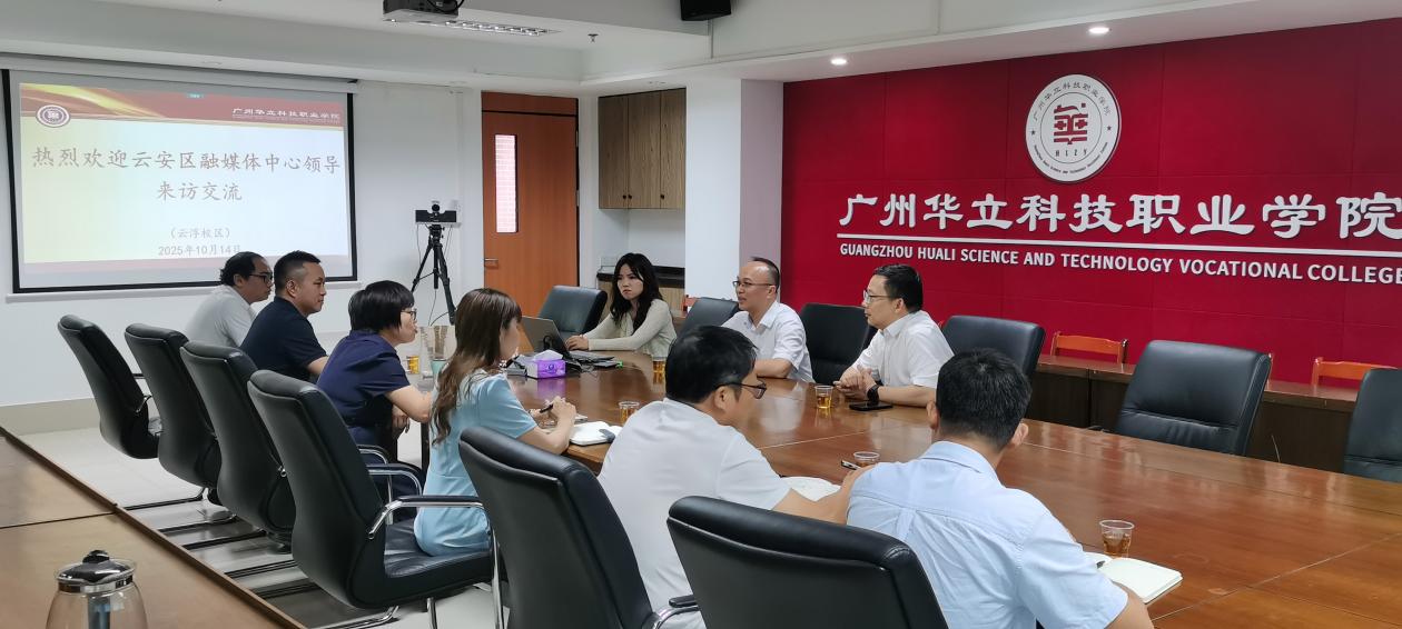 10月14日,云安区融媒体中心一行来到我校,围绕校地合作展开初步交流。双方通过上午的理论研讨与下午的实地走访,就“媒体+市场+教育+产业”四维协同发展路径进行了深入探讨,为未来合作奠定了良好基础。