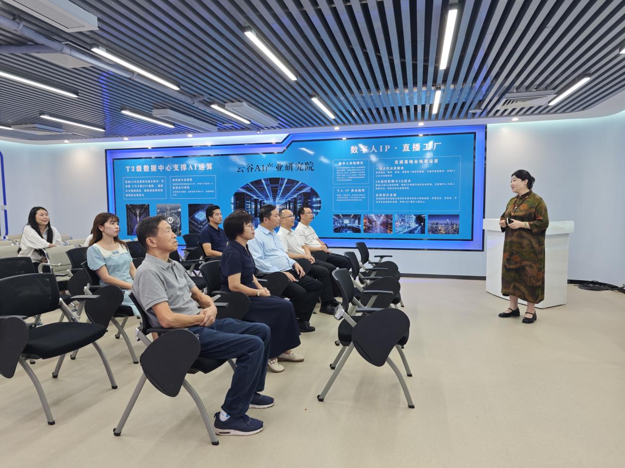 当天下午,云安区委常委、宣传部部长谢敬洪带队前往云谷AI产业研究院,参观云谷算力中心,开展AI技术应用交流。我校党委副书记、副校长王洪艳携学校办公室、实训中心、信息中心相关负责人参加交流活动。期间,双方就AI数字人技术发展趋势、政校企多元合作机制以及人才培养需求等方面展开交流,进一步拓展了合作视野。