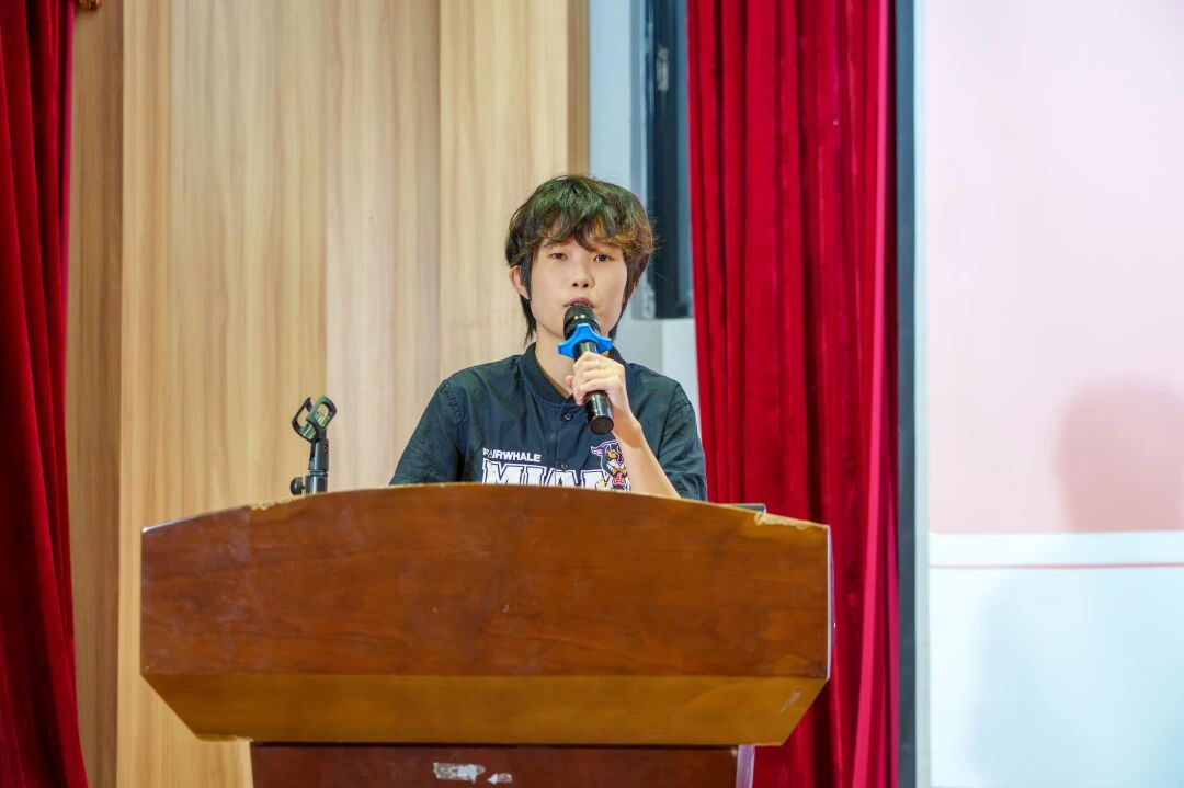 新媒体中心运营总监王佳韵作为学生代表上台发言。她表达对新成员的热烈欢迎与期望,感谢伙伴们的坚守与付出;强调团队协作的重要性,呼吁新成员在素材拍摄、推文撰写、跨岗位协作中务实严谨,共同推动团队发展。