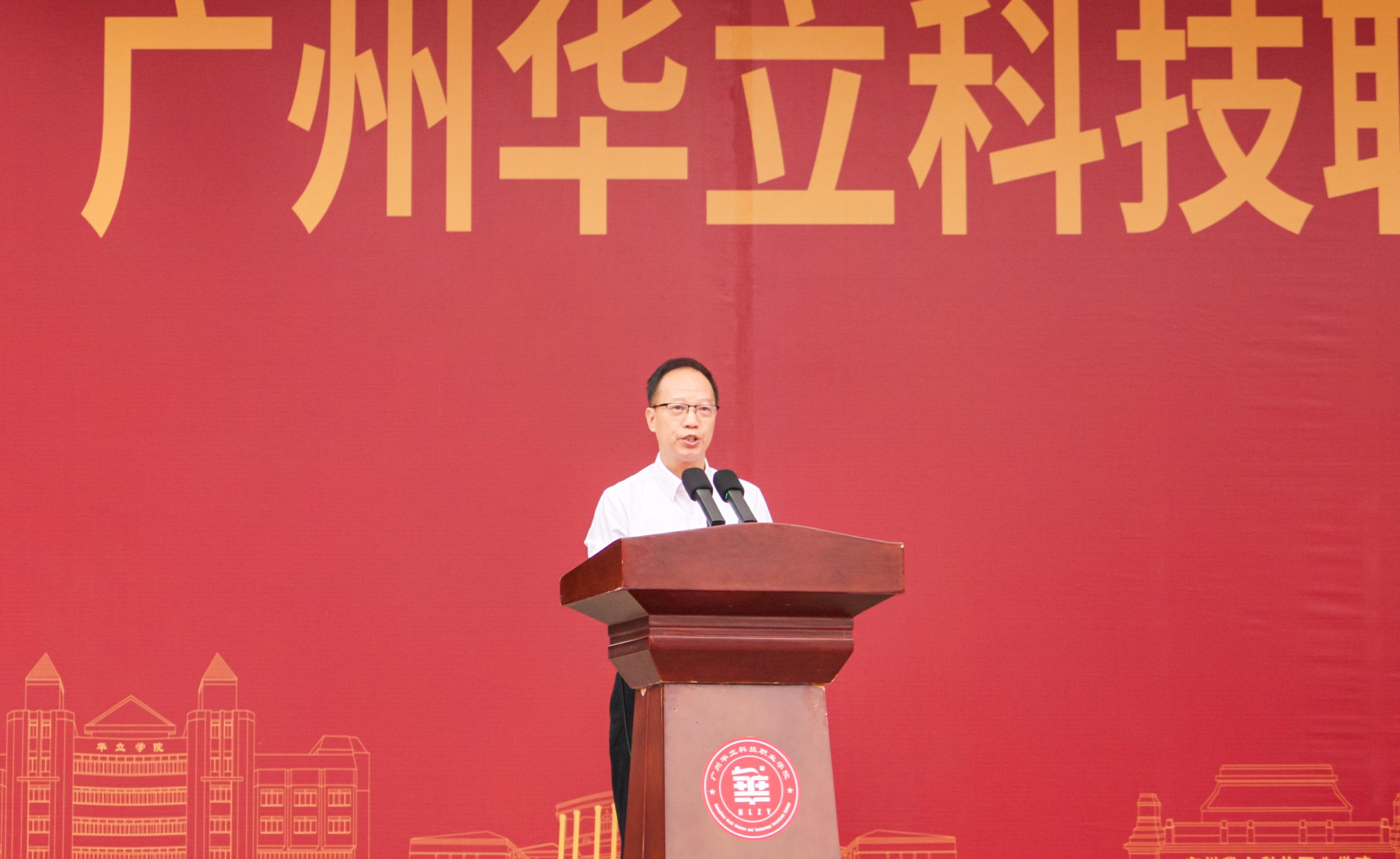 校党委书记陈良声作大会致辞。他代表学校全体师生员工,对2025级新生的到来表示最热烈的欢迎。陈书记回顾了学校的发展历程与办学成就。他指出,广州华立科技职业学院办学二十六年来,始终秉承"崇德、求是、博学、笃行"的校训,坚持立德树人根本任务,紧密对接现代化产业体系建设需求,积极拥抱数字经济浪潮,为建设教育强国、推进中国式现代化作出职业教育的贡献。过去一学年,学校在社会综合评价排名、国家级和省级荣誉、师生竞赛等方面成绩斐然,这些成就既凝聚着全体华立人的智慧与汗水,也奠定了同学们未来成长的坚实平台。