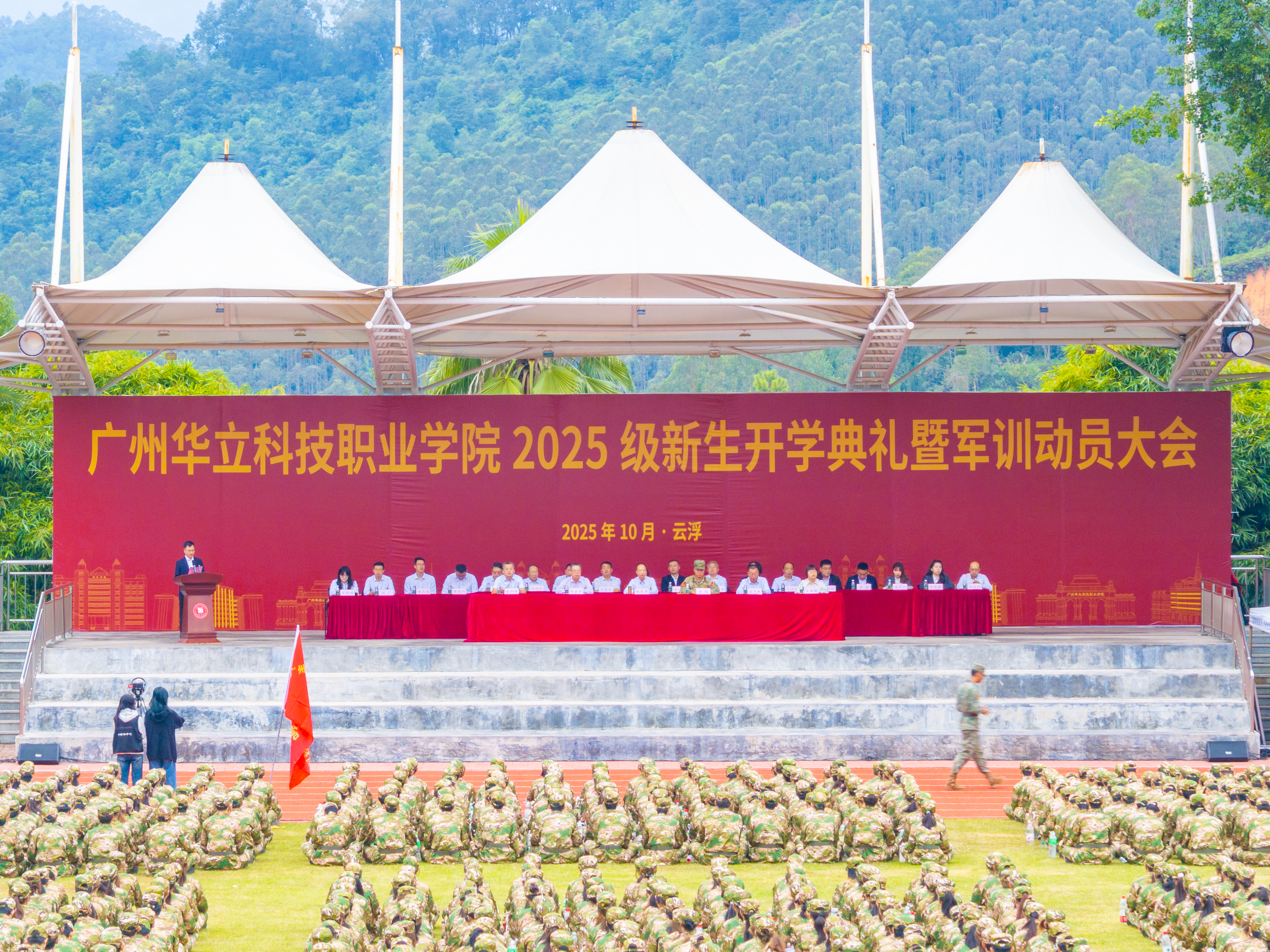 秋阳烁金,晨风送爽。2025年10月25日上午7时30分,我校云浮校区田径场上气氛庄重而热烈,广州华立科技职业学院(云浮校区)2025级新生开学典礼暨军训动员大会在此隆重举行。校领导陈良声、陈显强、高尧来、王洪艳、张剑锋,各职能部门及二级学院负责人、教师代表、辅导员与全体2025级新生齐聚一堂,共同见证这一庄严时刻。大会由学校党委委员、校长助理张剑锋主持。