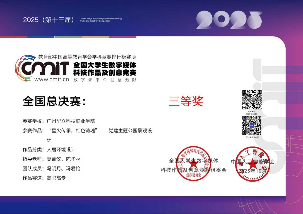 近日,第13届全国大学生数字媒体科技作品及创意竞赛圆满落幕。广州华立科技职业学院城建学院师生凭借优异的表现,从全国众多参赛队伍中脱颖而出,在全国总决赛中荣获三等奖2项,并在广东省赛区中摘得二等奖2项、三等奖2项,展现出扎实的专业能力与突出的创新水平。