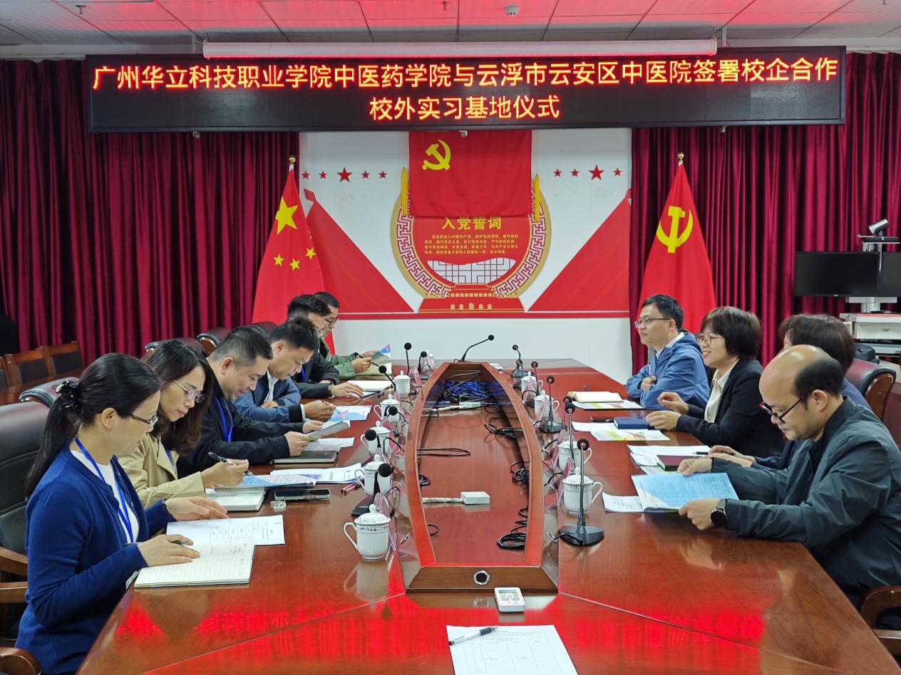 为深化产教融合,推动教育教学与临床实践紧密结合,提升中医药人才培养质量,2025年11月4日上午,广州华立科技职业学院与云浮市云安区中医院举行医校合作签约仪式。学校副校长王洪艳、招就处副主任张雄、中医药学院副院长张志勇、陈耀辉及学院骨干教师代表一行赴云安区中医院参加活动。