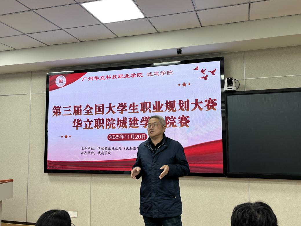 城建学院院长徐耀鉴教授作大赛致辞。他指出,职业规划是学生成长成才的“导航图”,也是学院人才培养的关键环节。他鼓励同学们以赛促学、以赛促练,在比赛中找准职业方向,将个人理想融入行业发展与国家需要,为未来职业道路奠定坚实基础,并预祝大赛圆满成功。