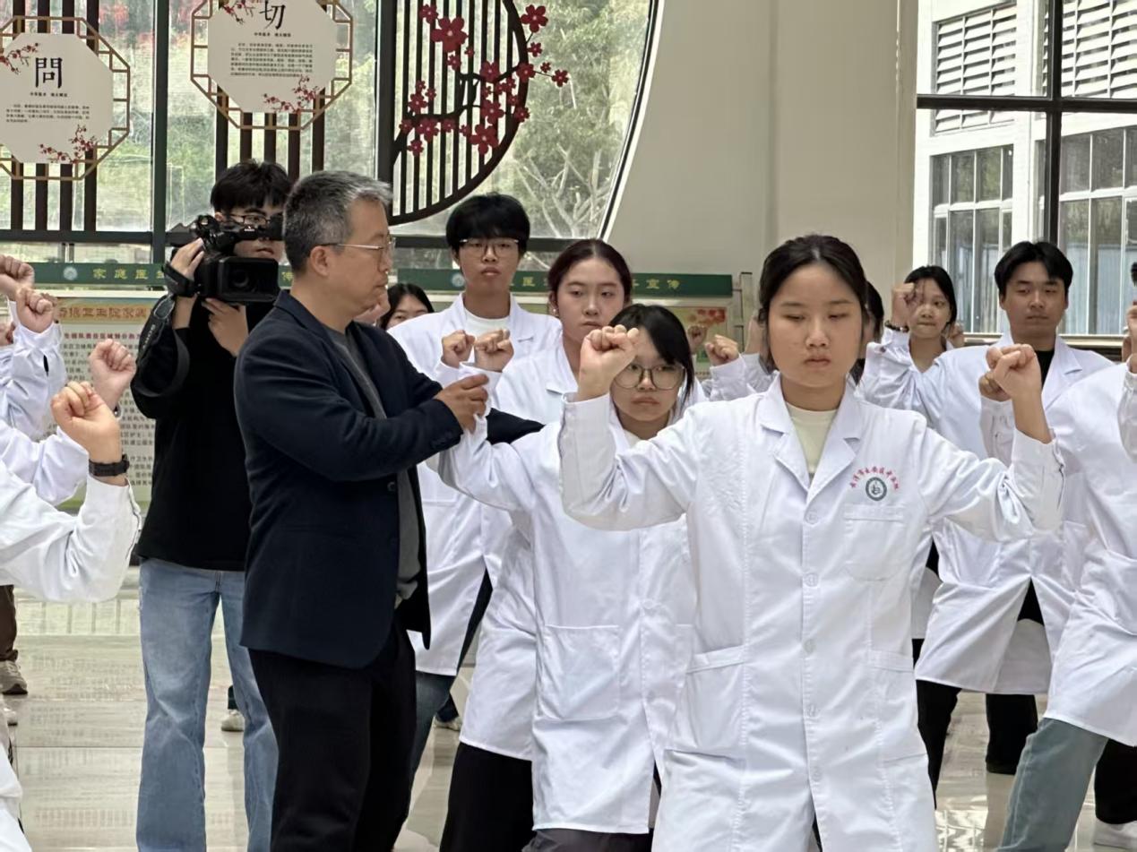 在练习环节,我院师生代表与云安区中医院医生代表一同跟随练习,积极与余教授交流动作要领,现场气氛热烈。不少同学表示:“看似简单的动作蕴含着丰富的中医理念,练习后身心都得到了明显放松。”