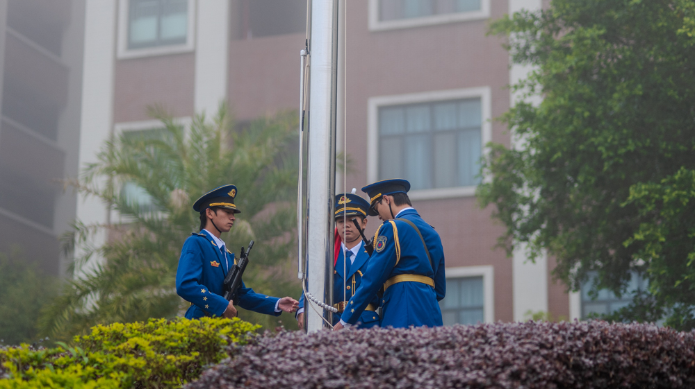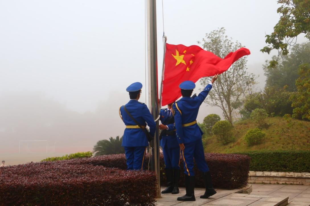 清晨,英姿飒爽的国旗护卫队迈着铿锵有力的步伐,护卫着鲜艳的五星红旗走向升旗台。在雄壮激昂的《义勇军进行曲》中,全体师生庄严肃立,行注目礼,注视着五星红旗冉冉升起,迎风飘扬在校园上空。