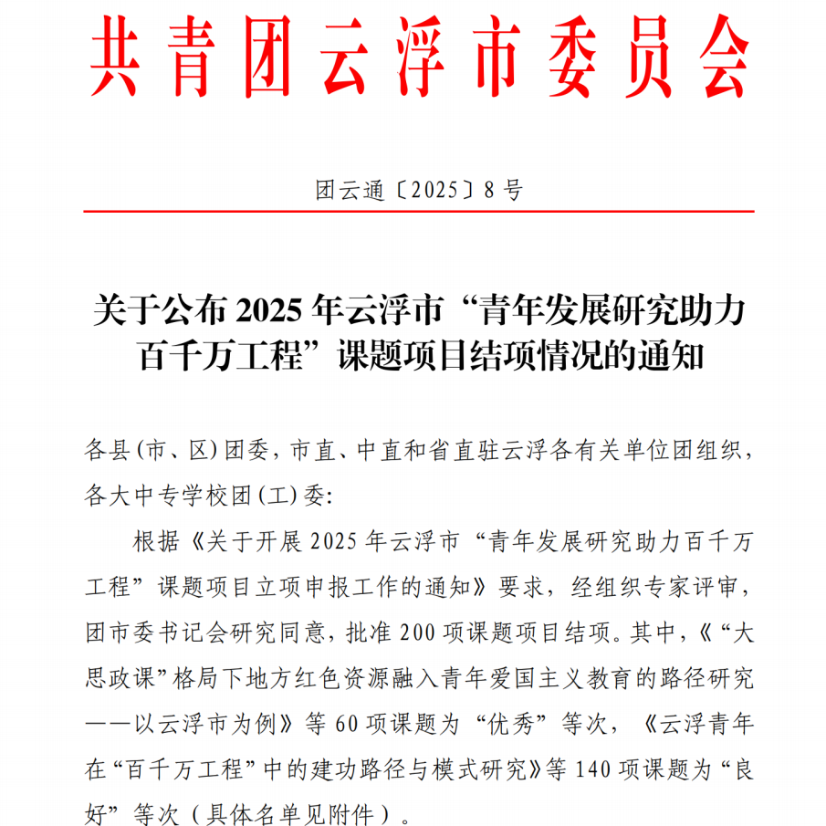 近日,在云浮市“青年发展研究助力百千万工程”2025年度课题结题评选中,我校课题研究实现质与量双突破,结题率与优秀成果比例均创新高。