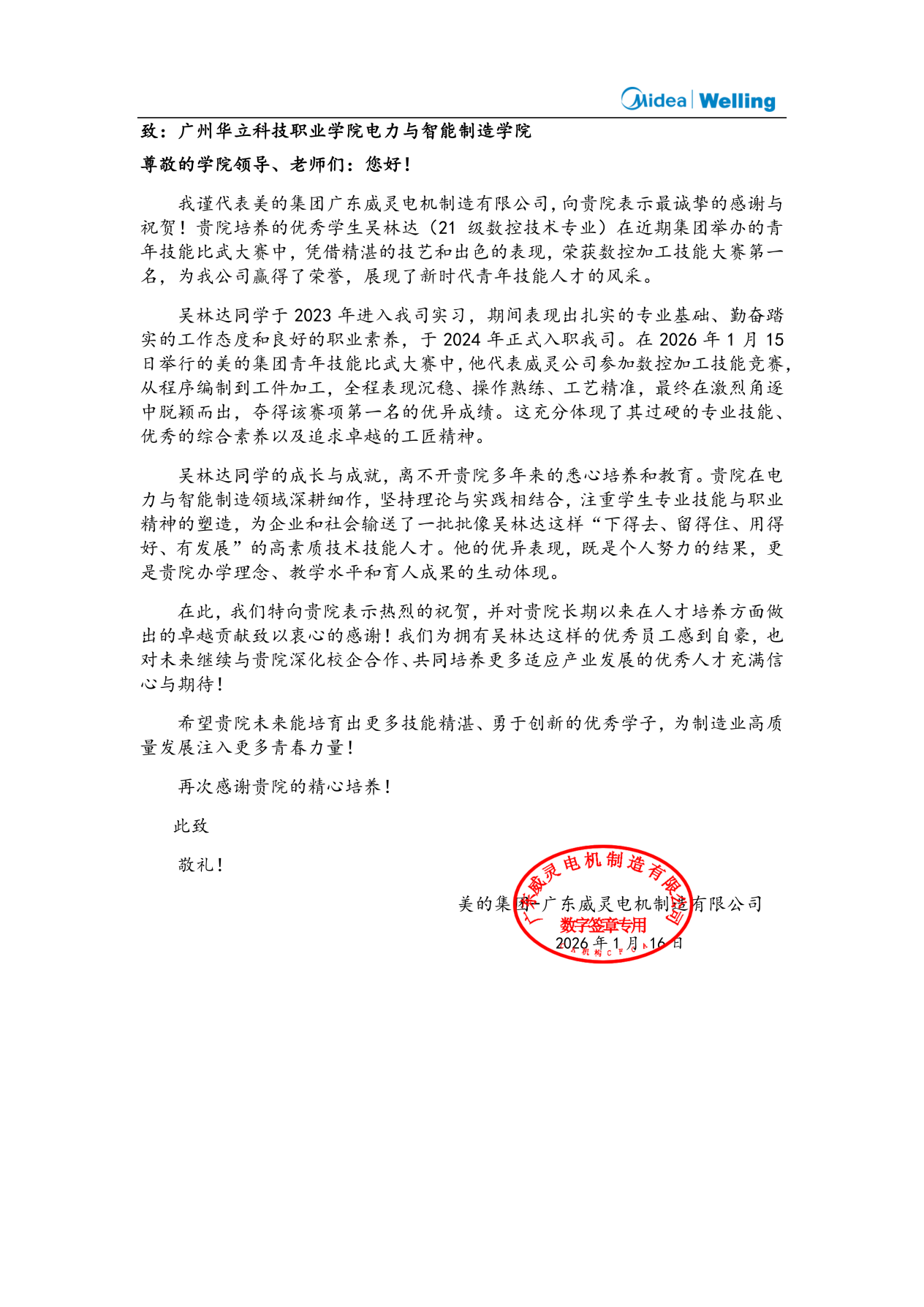 近日,我校收到美的集团广东威灵电机制造有限公司发来的感谢信,对广州华立科技职业学院电力学院云浮校区21级数控技术专业学生吴林达在美的集团青年技能比武大赛中荣获数控加工技能第一名表示热烈祝贺,并对我校人才培养质量给予高度评价。