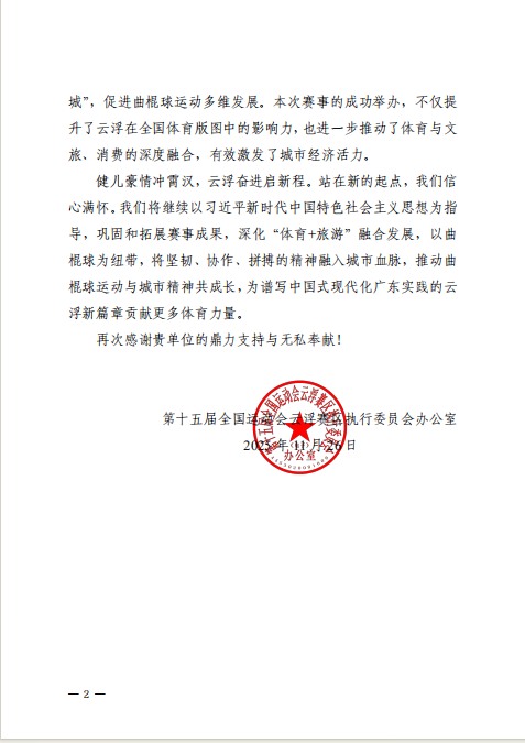 10月26日至11月15日,138名志愿者奔赴第十五届全运会云浮曲棍球赛场,全面参与赛事服务。他们团结协作、恪尽职守,以青春诠释责任,最终获得赛区执委会办公室及志愿服务处的书面感谢。