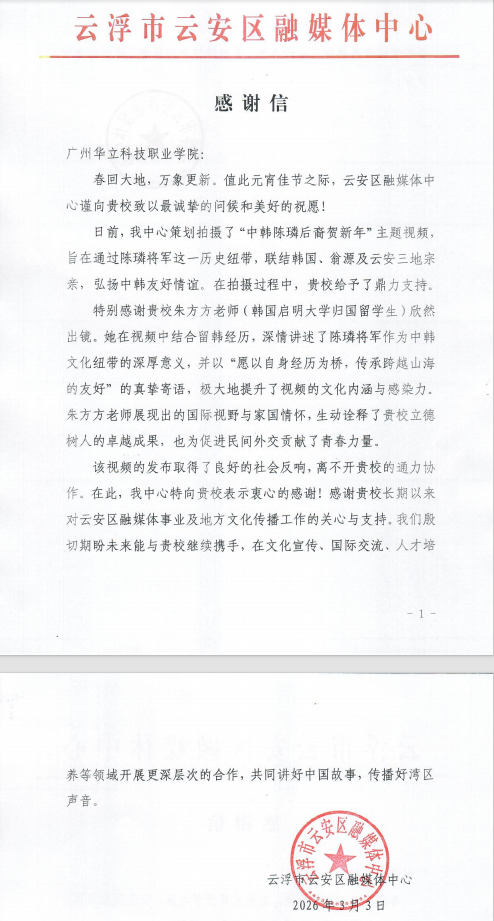 2026年3月3日,正值元宵佳节,云安区融媒体中心向广州华立科技职业学院发来感谢信,感谢学校及我校朱方方老师在“中韩陈璘后裔贺新年”主题视频拍摄中的鼎力支持与精彩表现。信中高度评价朱方方老师以国际视野和家国情怀,生动诠释了学校立德树人的卓越成果,为促进民间外交贡献了青春力量。