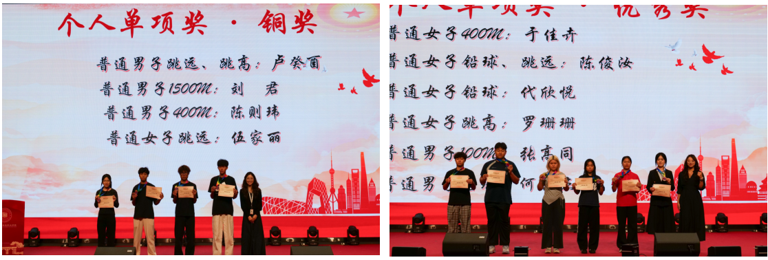 文体竞赛领域捷报频传。钟玉萍、朱弘业分获个人单项金牌,周颜、吴国杰等4名同学摘得银牌,卢癸酉、刘君等4名同学获得铜牌,陈俊汝等6名同学获个人单项优秀奖。团体项目中,普通组20×200米混合团体接力荣获集体项目一等奖,普通女子组4×400米接力获得三等奖。此外,新生杯篮球赛、羽毛球赛的冠亚季军队伍也依次登台领奖:吴国杰同学领衔的队伍夺得篮球赛冠军,方升校所在团队拿下羽毛球赛冠军。一张张奖状、一项项荣誉,见证了学子们的拼搏与汗水。