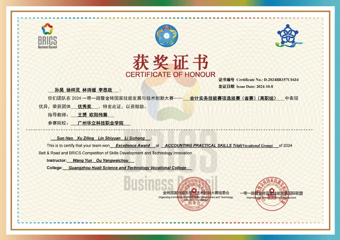 2024一带一路暨金砖国家技能发展与技术创新大赛会计实务技能赛项,优秀奖