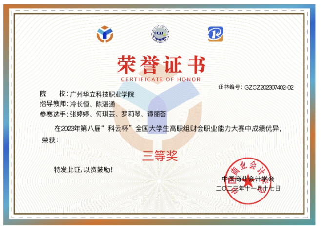 第八届“科云杯”全国大学生高职组财会职业能力大赛,三等奖