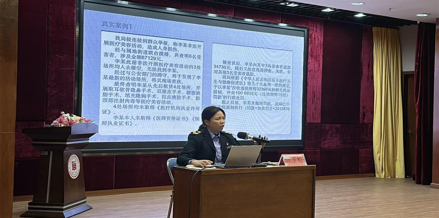 讲座中,陈玉梅专家结合典型案例与监管实践,围绕非法医美界定、常见陷阱、健康危害、识别方法、维权途径五大核心内容展开讲解。她明确指出,注射填充、光电治疗、微创整形等均属于医疗美容范畴,必须在取得《医疗机构执业许可证》的正规机构、由具备资质的医师操作;生活美容馆、私人工作室等均属非法行医,极易引发感染、血管栓塞、毁容等严重后果。她重点传授“三查三看”实用技巧:查机构资质、查医师资质、查药械来源;看场所环境、看知情告知、看正规票据,帮助同学们快速辨别合法与非法医美。同时提醒大家警惕“低价引流”“零风险承诺”“美容贷”等套路,遭遇侵害时留存证据、及时举报维权。