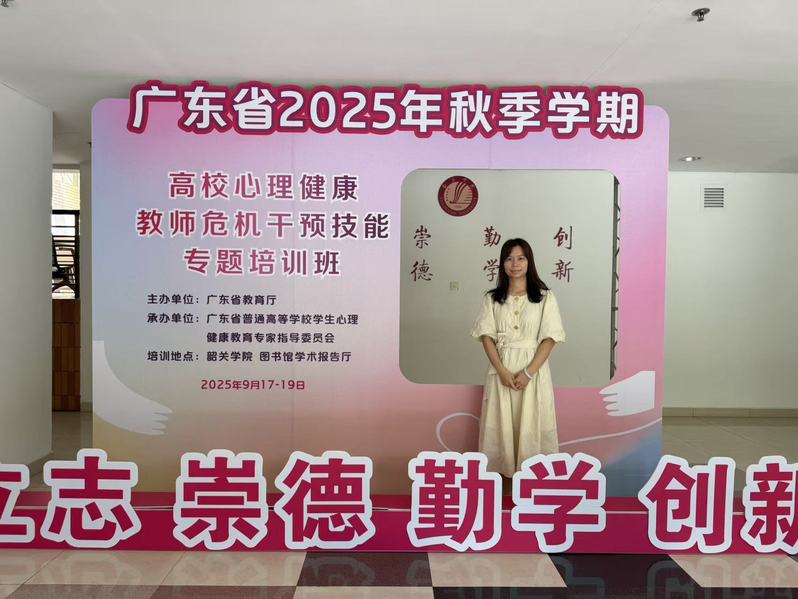 为进一步提升我省高校心理健康教师在危机识别、评估与处理方面的专业能力,2025年9月17日至19日,由广东省教育厅主办、广东省普通高等学校学生心理健康教育专家指导委员会承办的“2025年秋季学期高校心理健康教师危机干预技能专题培训班”在韶关学院顺利举行。我校心理健康教育与咨询中心副主任何丽明老师参加了本次专题培训。
