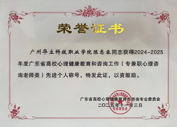 心理中心教师陈志容荣获“(专兼职心理咨询老师类)先进个人”称号