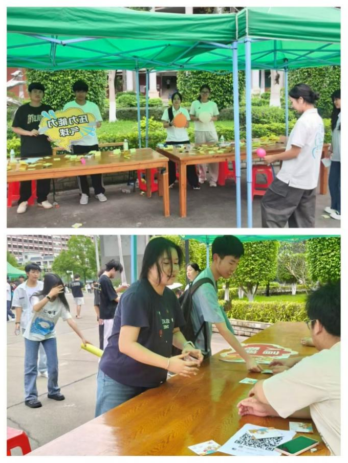 活动现场秩序井然,欢声笑语不断。同学们穿梭于各个摊位,积极参与各项游戏,在互动中释放情绪、增进交流,既体验了趣味挑战,也舒缓了日常学习生活的压力。
