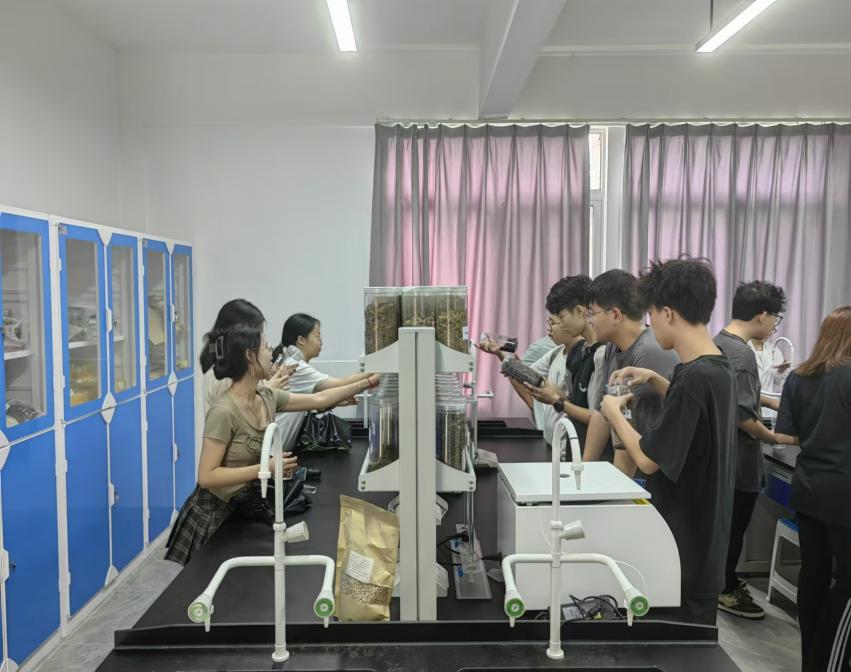 新生们来到了药物制剂实验室,实验室负责人以生动形象的方式,向大家展示了中药材从采集、炮制到最终成为成品的全过程。通过亲手操作简易的中药制剂小实验,新生们深刻体会到了药物制剂工艺的复杂性与科学性,对中医药现代化的成就有了更为直观的认识。